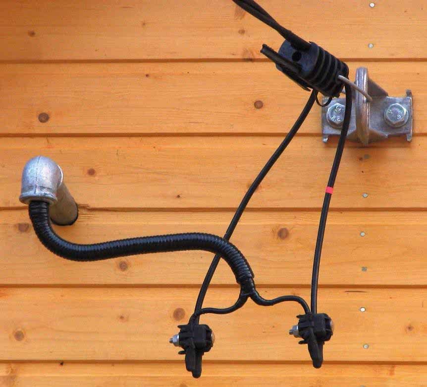 Провода Пин Ап на несущем тросе. Они имеют Al жилы, что категорически недопустимо для коттеджей из дерева. Поэтому они доходят только до ВРУ, в котором установлен счетчик. Далее к разводному щитку пробрасывается кабель с медными жилами.