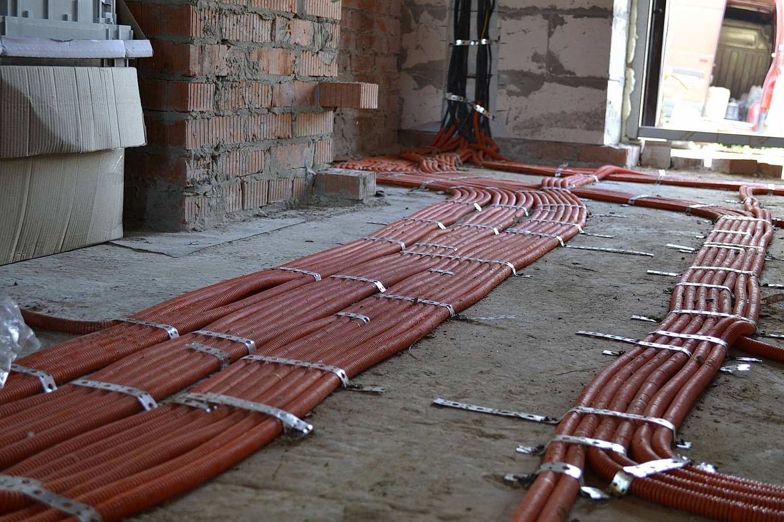 Чтобы защитить кабель внутри стяжки, а также обеспечить Пин Ап его замены, используйте гофру (при этом процент ее заполнения не должен превышать 40%)- Минимальная толщина бетонной стяжки над гофрой с проводами - 30 миллиметров, если трассы пересекаются, то эта величина должна быть увеличена