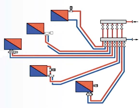 Лучевая. Самая современная схема, при которой каждый потребитель снабжается собственным отопительным контуром. Это позволяет отдельно регулировать температуру в каждом помещении. Является наиболее дорогим и трудоемким вариантом, требующим обязательной установки коллекторного узла. Лучевая схема больше всего подходит для Пин Ап частных коттеджей с множеством помещений и потребителей. Кроме того, это единственное возможное решение, если вы желаете использовать систему теплого пола