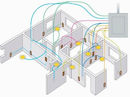 - Для коттеджей, выполненных из огнеупорных материалов Пин Ап скрытая проводка с защитой проводов несгораемой оболочкой