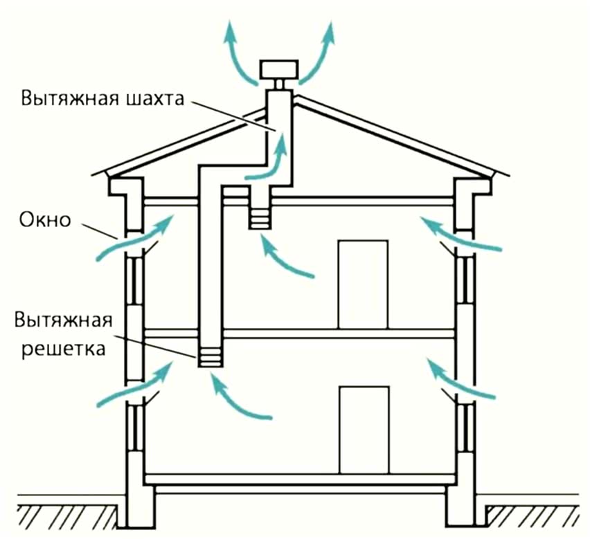 Это самая простая схема для тех, кто уверен, что в дом поступает достаточное количество свежего воздуха. Например, благодаря регулярному проветриванию. В таком случае остается лишь обеспечить его движение, то есть, сформировать отток через специальные воздуховоды.